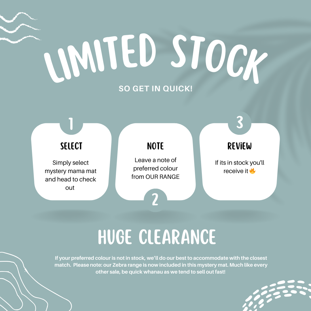 NOTE: these mats for the mystery products are brand new mats. May include but not limited to: Te Aramoana, Tai timu tai Pari, Tāniko, Zebra, custom Māori designs — All colours from our pastel and original range.